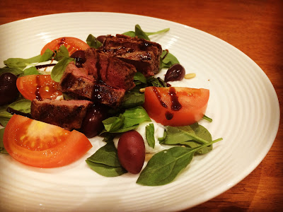 - Place your meat and tomatoes on top of your salad ingredients and drizzle with some caramelised balsamic vinegar.